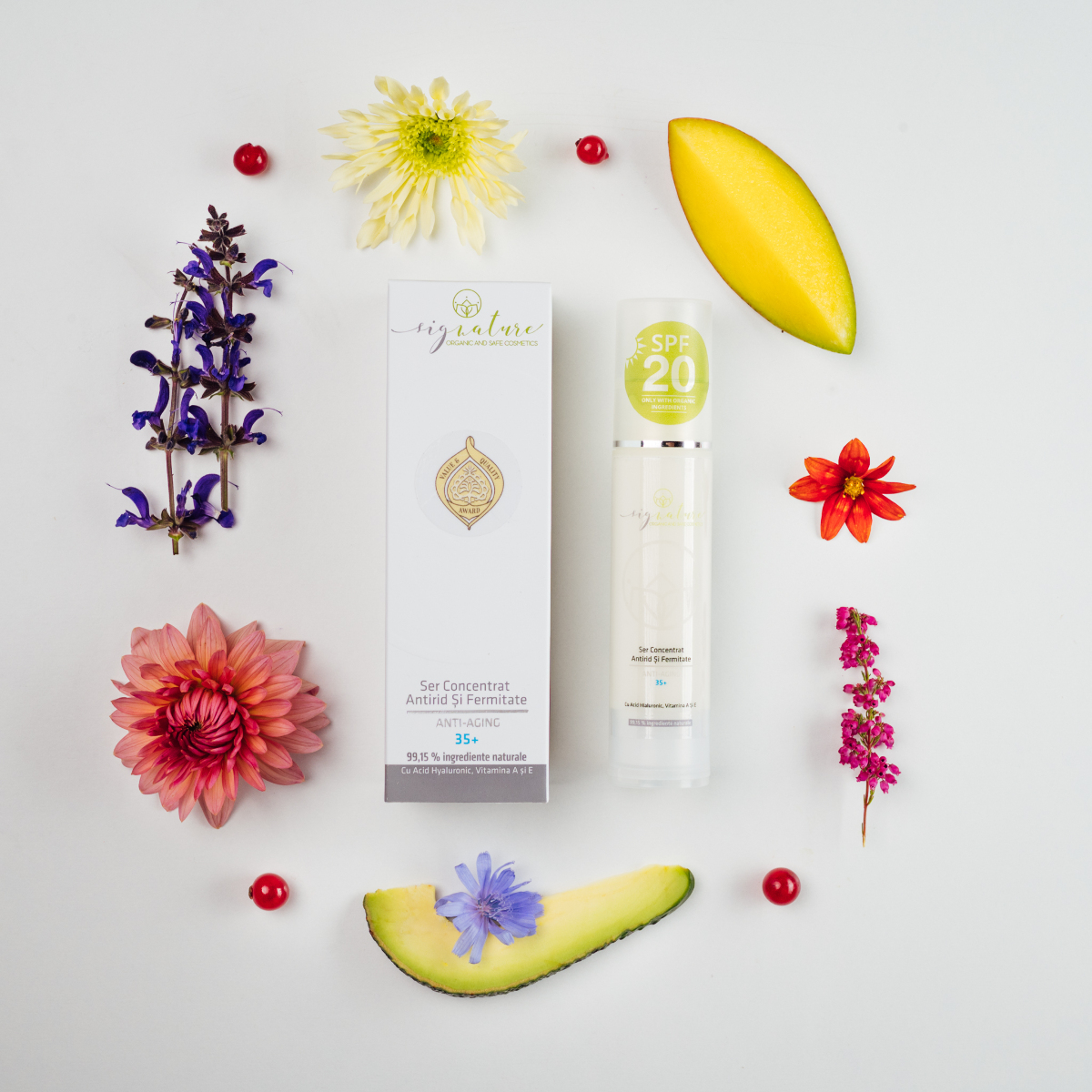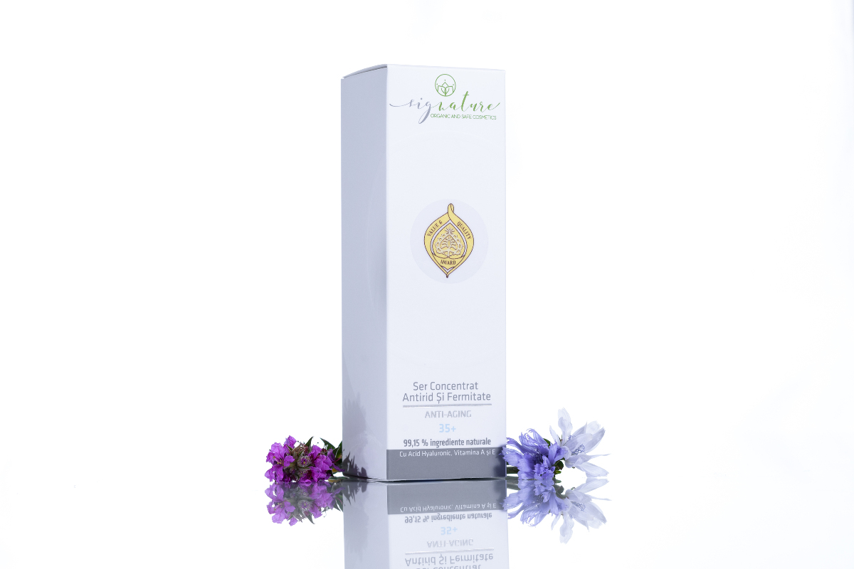 Serul antirid SigNature conține acid hialuronic pur, cu moleculă mică capabil să ajungă în dermis, unde reține apa și protejează colagenul. Fructo-oligosaharidele din Cicoarea comună au efect imediat de lifting și anti-aging. Flavonoizii din Iarba sfântului Ion duc la hidratarea pielii. Vitaminele A și E au efect antioxidant, neutralizează radicalii liberi din piele și previn dezintegrarea fibrelor de colagen.