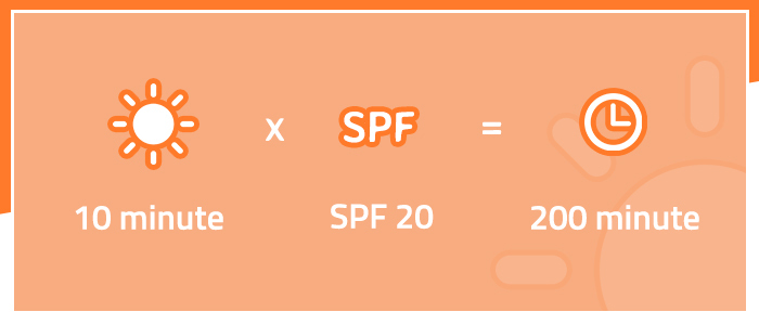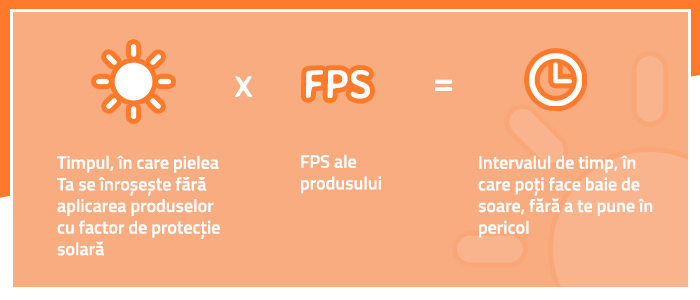 SPF sau Factorul de Protecție Solară este determinat de timpul în care pielea noastră se poate proteja singură de soare, de radiații solare, fără ca aceasta să se ardă. Acest interval de timp depinde de mai mulți factori ca de exemplu: tipul de piele, tip de ten, anotimp, zonă geografică, etc. și în mod general variează între 5 - 30 de minute. Ți-am pregătit o formulă pentru a calcula ușor timpul maxim pe care poți petrece la soare utilizând produse cu un FPS dat.